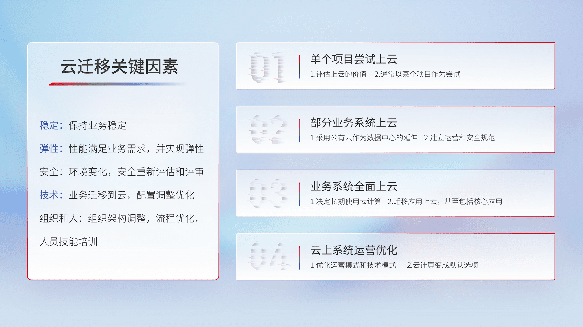 结合实际业务,,,从规划设计、、、云平台选型、、、、云原生改造、、、、数据迁移、、集成交付,,,,迁移全过程为客户识别最佳上云路径,,,做好风险识别管理,,,,设计网络架构、、身份权限、、安全审计合规、、、操作审计、、、、日志审计、、监控告警策略、、、、多站点容灾设计等,,,,对云上基础设施进行整体规划,,提升IT治理水平,,以满足弹性、、高可用、、、高性能的需求。。
