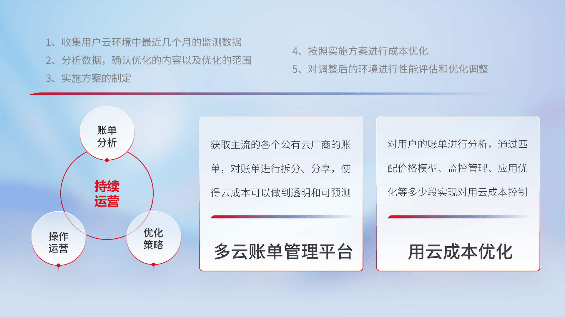 通过多云纳管,,以统一的资源数据模型把客户的云资源进行抽象和封装,,,,进而实现对多云资源的统一操作,,,,保障云资源管理的可靠性、、稳定性与可用性。。量身定制化运维内容,,配置、、、开发运维、、、补丁管理、、、、备份、、、、监控、、、认证和访问管理、、审计和日常巡检等,,,,保障在用云过程中的可靠度,,,,稳定度以及高可用率。。。